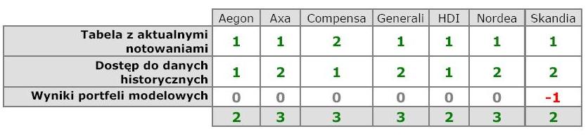 Wyniki portfeli modelowych. W przypadku firmy Skandia odjęto jeden punkt. Portfele modelowe mają swoje wyceny - nie są one publikowane jednak na stronie z wynikami. Podana jest tylko zmiana procentowa. Dostęp do wycen tych portfeli możliwy jest dopiero gdy korzystamy z porównywarki wyników funduszy.