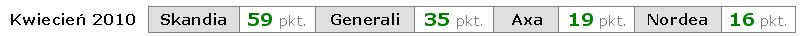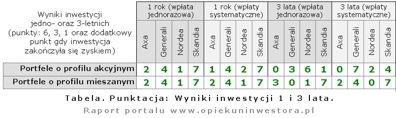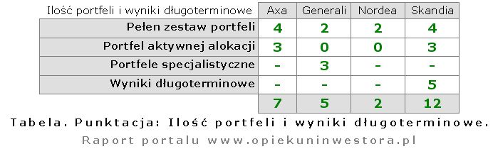 Zwycięzca rankingu to portfele modelowe firmy SKANDIA. Zwycięstwo zawdzięcza dobrym wynikom portfeli w ostatnim roku. Drugie miejsce firmy Generali to wynik dużej ilości portfeli co pozwoliło na zajęcie dobrych miejsc w 8 przeprowadzonych analizach. Firma Axa jedynie dzięki posiadaniu w ofercie portfela aktywnej alokacji (5 punktów) uzyskała wynik wyższy niż portfele firmy NORDEA.