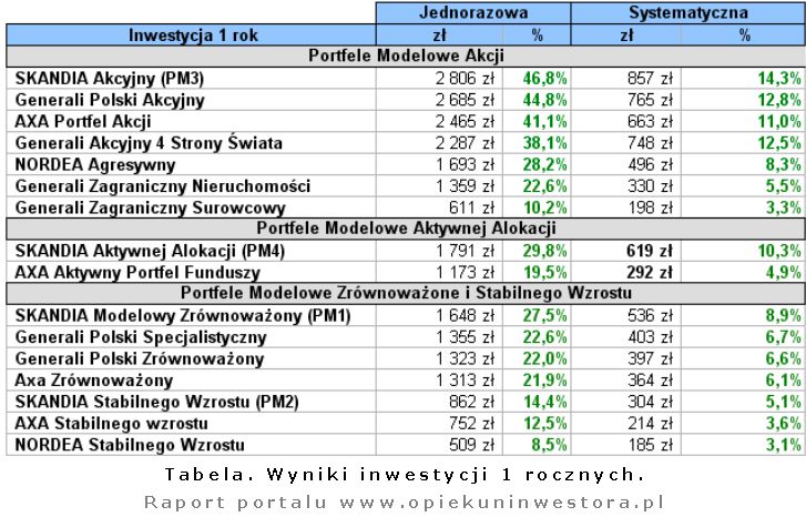 Wyniki krótkoterminowe portfeli akcyjnych i mieszanych (rok i 3 lata, osobno dla wpłaty jednorazowej i wpłat systematycznych) - w sumie 8 zestawień
