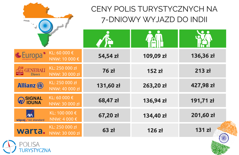 Poniżej podajemy przykładowe symulacje cen ubezpieczenia turystycznego do trzech państw: Hiszpanii, Stanów Zjednoczonych oraz Indii. Porównania dokonano dla samotnie podróżującej osoby, dwójki osób oraz dla 3-osobowej rodziny. Wyżej podani zdecydowali się na 7-dniowy zagraniczny wyjazd, nie mają zamiaru uprawiać sportów oraz chcą być chronieni od następstw nieszczęśliwych wypadków.